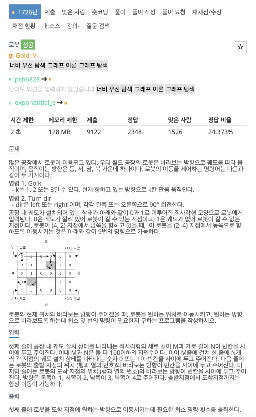 # BFS+시뮬레이션 문제였다. 기본적인 BFS에 명령 1.Go k, 명령2. Turn dir를 구현해주면 된다. 또 생각없이 풀다가