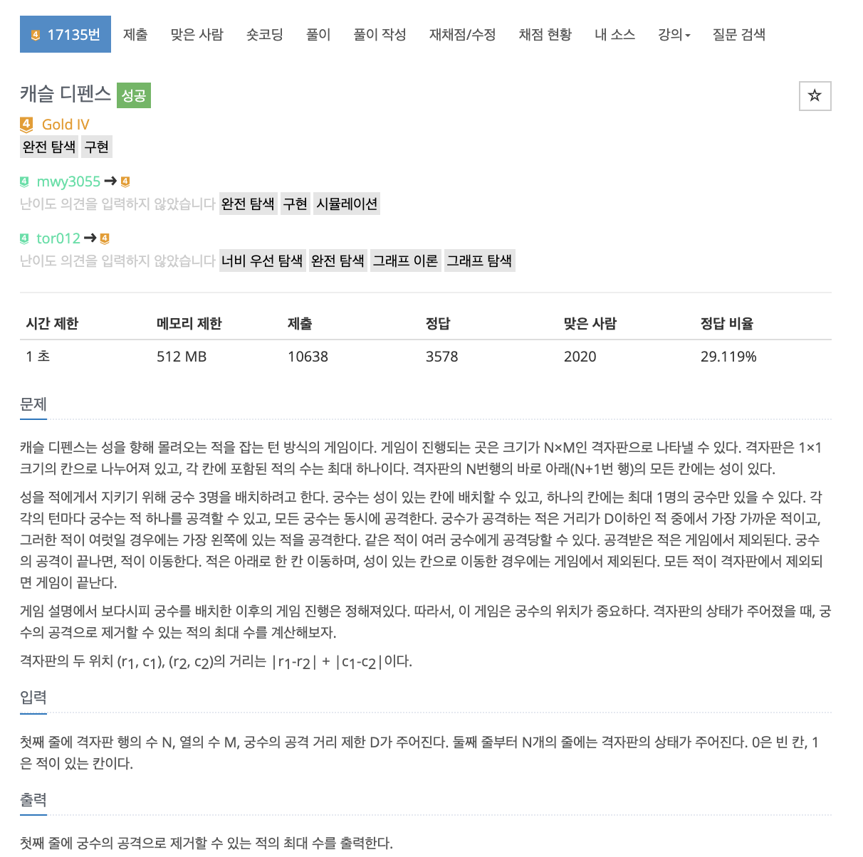 # 조합을 통해 궁수의 위치를 정한다. 정한 후, 조건에 맞게 사격, 남은 적들은 y칸들을 1씩 증가. 이 작업을 적이 다 죽거나 궁수 있는 곳까지 도달할 때까지 반복한다.