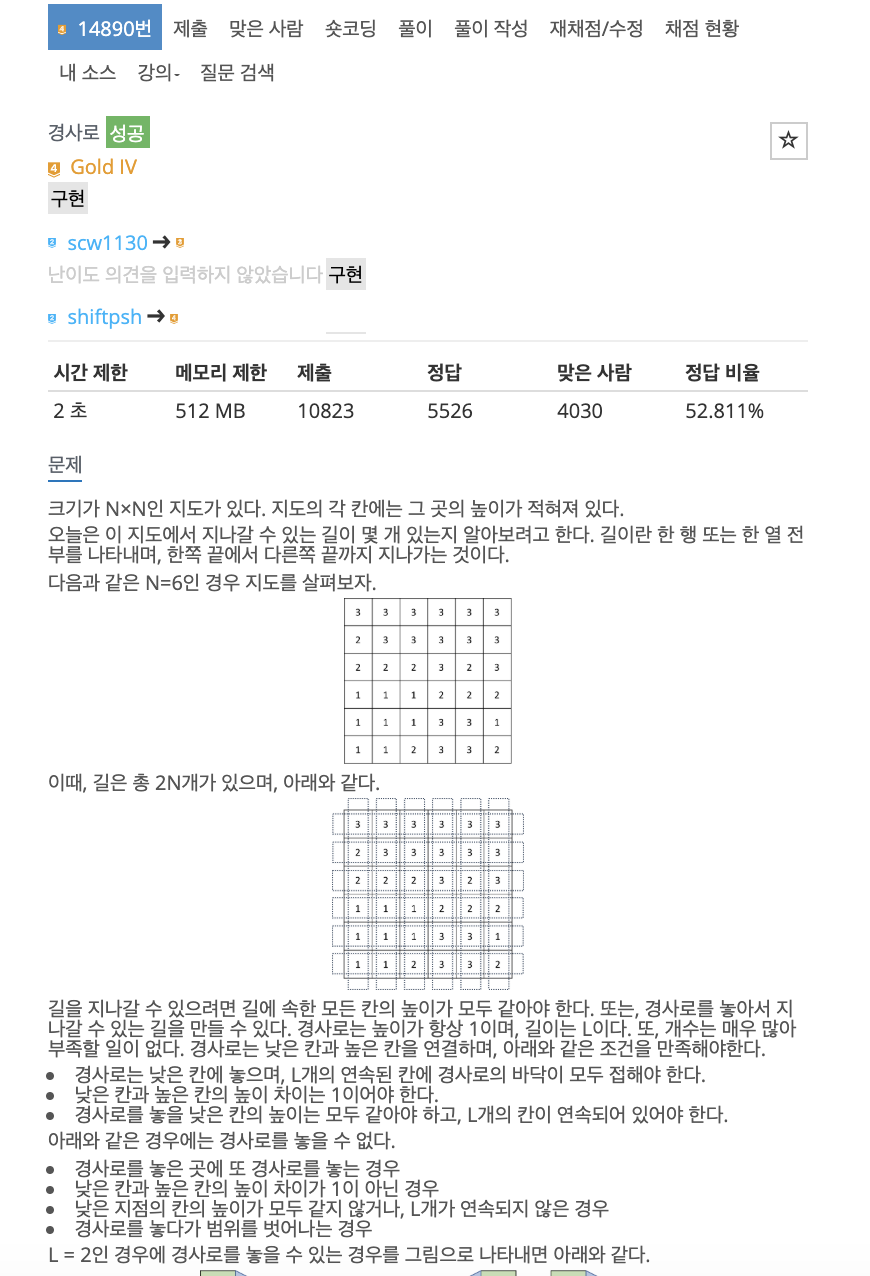 # 문제 이해하기가 제일 어려웠다.. 경사로 놓을 수 있는 조건과 그렇지 않은 조건만 잘 체크해준다면 어렵지 않게 풀 수 있다. 가로 세로 전부 다 구해줘야 하는 문제였다.