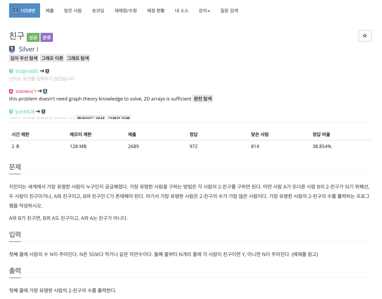 // 한 다리 건너서 아는 친구 + 서로 친구