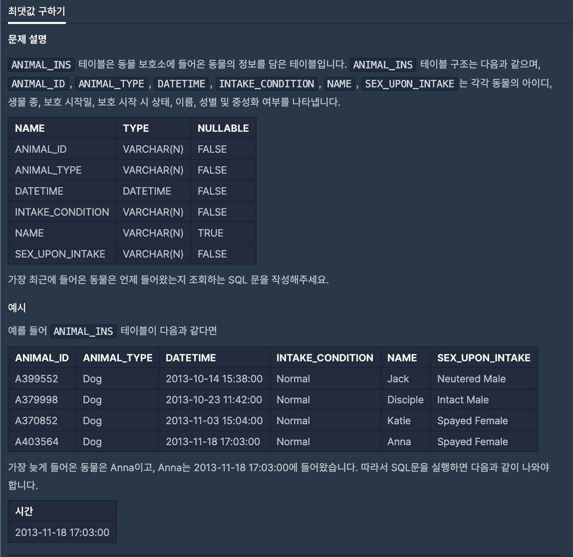 SELECT MAX(DATETIME) AS '시간' FROM ANIMAL_INS