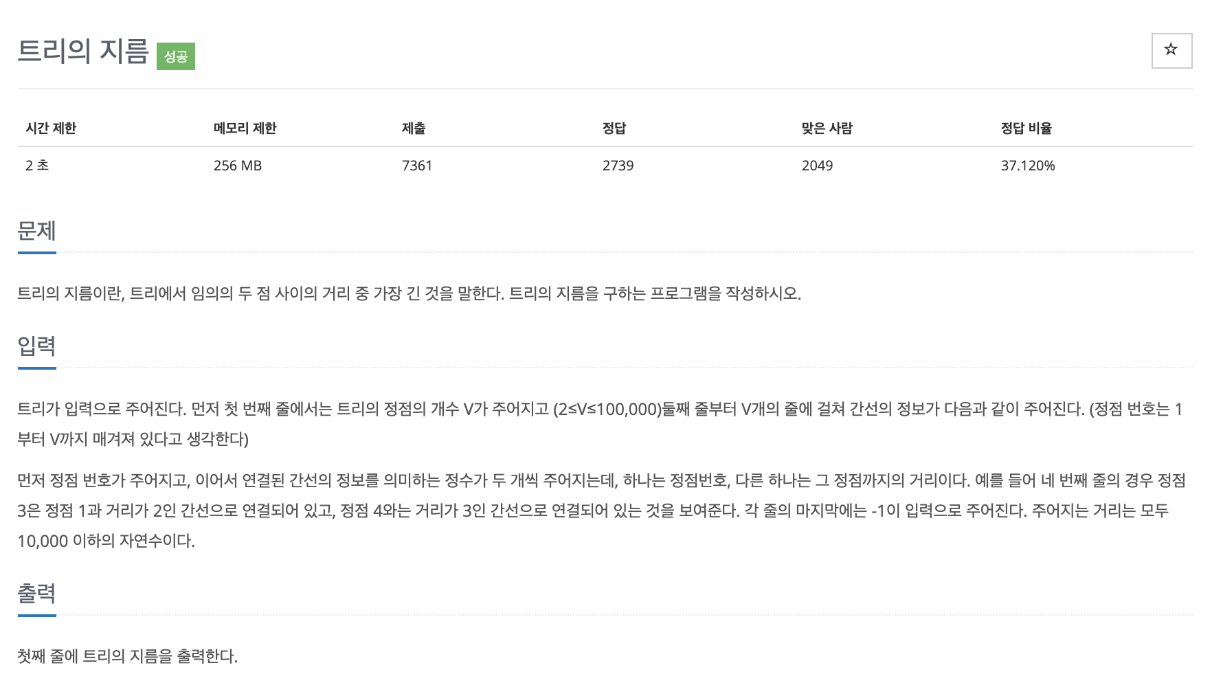 트리의 지름을 구하는 방법을 알아야 풀 수 있던 문제, 맨 처음에 dfs를 사용하여 가장 긴 길이를 갖고 있는 정점을 구한 후, 그 정점을 기준으로 다시 dfs를 사용하여 트리의 지름을 얻어야함.
