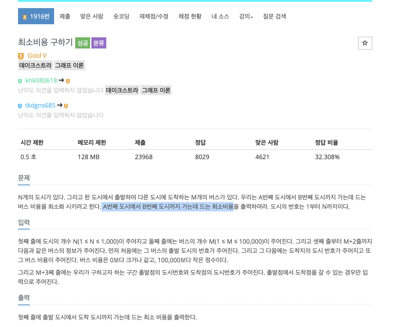 # 우선순위큐를 바탕으로 다익스트라 알고리즘을 구현하면 된다. 보통 A번째 도시에서 B번째 도시까지 가는데 드는 최소비용은 최단거리 문제이며, 정점을 기준으로 다익스트라인지 플로이드와샬인지, 음수 포함여부에 따라 벨만포드 등으로 나뉘어진다.