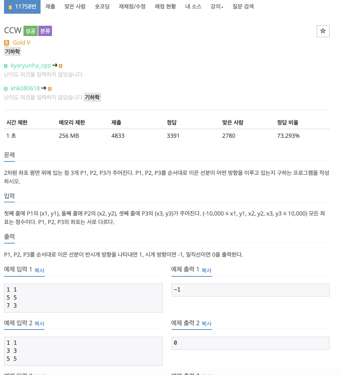 // CCW는 점 A,B,C를 순서대로 봤을때 반시계방향으로 놓여 있으면 양수를, 시계방향이면 음수를, 평행하게 놓여있으면 0을 반환하게 됩니다.