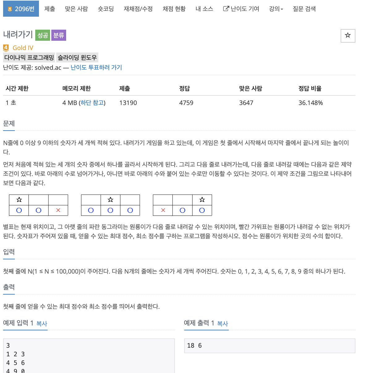 # 다이나믹 프로그래밍의 전형적인 문제로, 현 위치에서 어디로 내려갈 수 있는가를 따지면 된다. 인덱스를 1,2,3 이라고 하였을 때