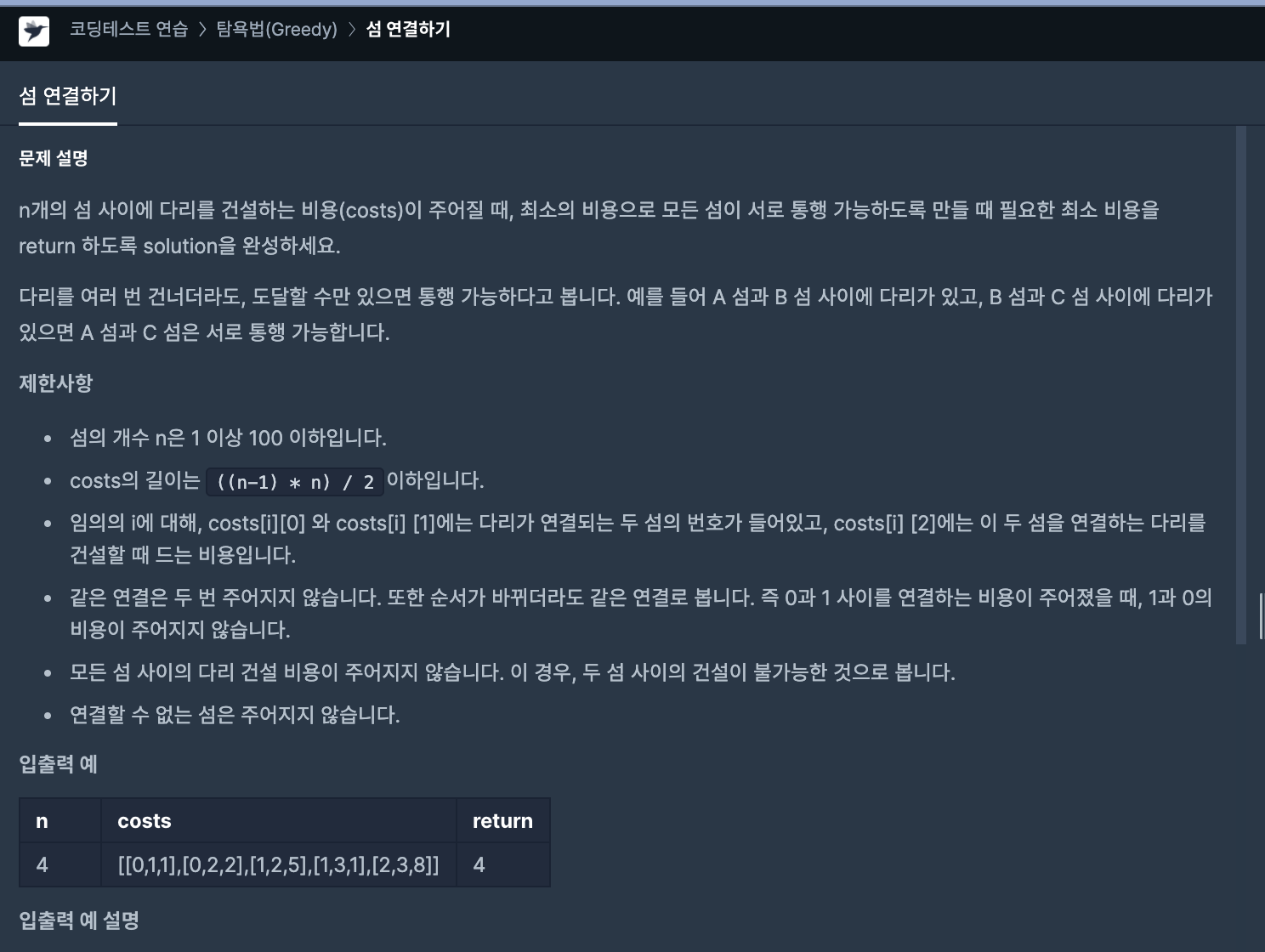 # 그리디 기반의 크루스칼 알고리즘으로 문제를 해결하였다. 크루스칼 알고리즘을 사용하기 위해서는 싸이클을 체크해야하고(트리에서는 싸이클을 허용하지 않는다.) 이를 위해 union-find 방식을 사용하였다.(간단하게 말하면 어느 집단에 속해있는지, 부모가 누구인지 체크하는것으로 싸이클을 체크하는 데 사용).