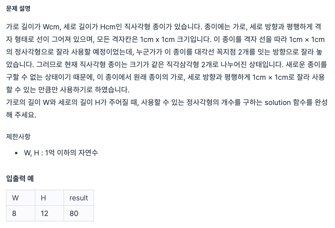결과로, 사용할 수 없는 직사각형의 공통점은 w+h-(w,h)의 최대공약수가 맞다는 것을 확인할 수 있다.