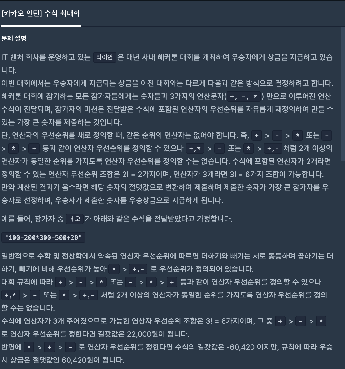 우선 숫자와 연산자를 분리하여 각각 배열리스트에 담고 연산자의 우선순위를 정하며 가장 큰 절대값을 탐색하였다.