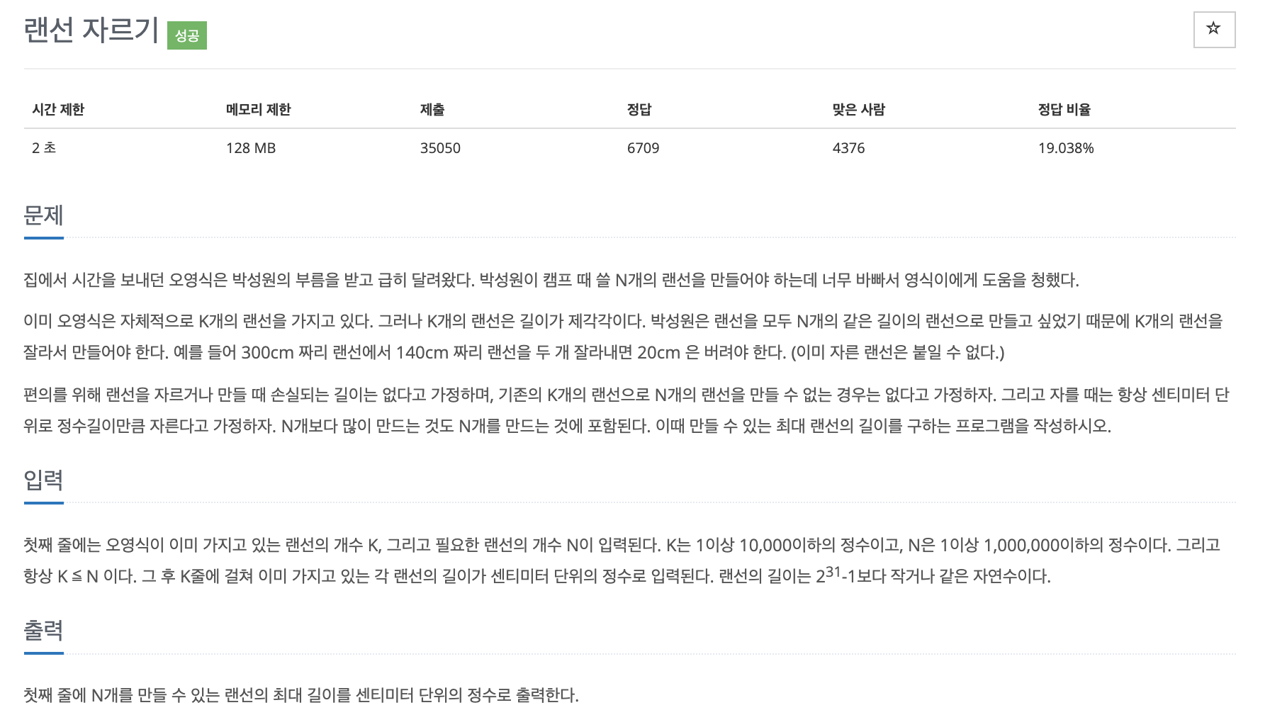 # 최대 랜선 길이를 찾는 것이므로, count가 조건과 같다고 return 하여 문제를 접근하였으나 틀렸고 Count를 맞춰도 최대 길이를 찾아야 하기 때문에 추가적으로 left = Middle + 1 로 주어 진행하여야 한다. 단위가 크므로 long 타입을 쓰지 않으면 틀림