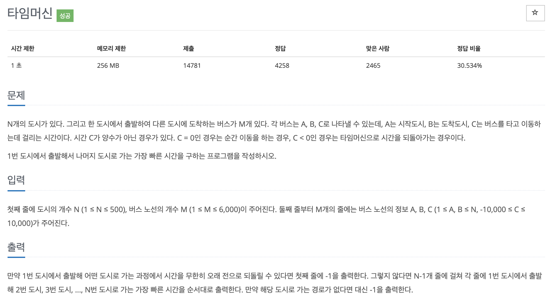 처음 반복문을 돌려 최소 거리를 구하여 dist 배열을 갱신한다. 그 후에는 음의 값을 가지고 있는 간선으로 인해 싸이클이 형성되는 케이스를 체크해주어 해결하면 된다.