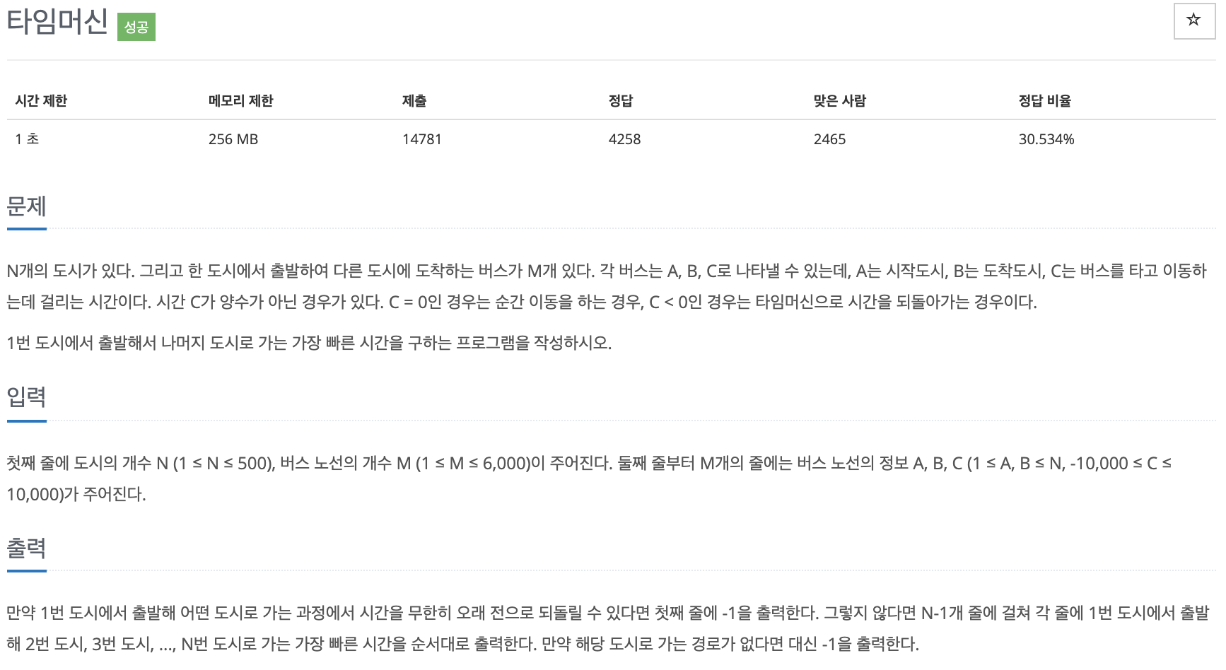 # 벨만포드 알고리즘을 알고 있다면 쉽게 해결이 가능하다. 중복되는 글이지만 https://ukyonge.tistory.com/26를 읽어 보는것도 추천한다.