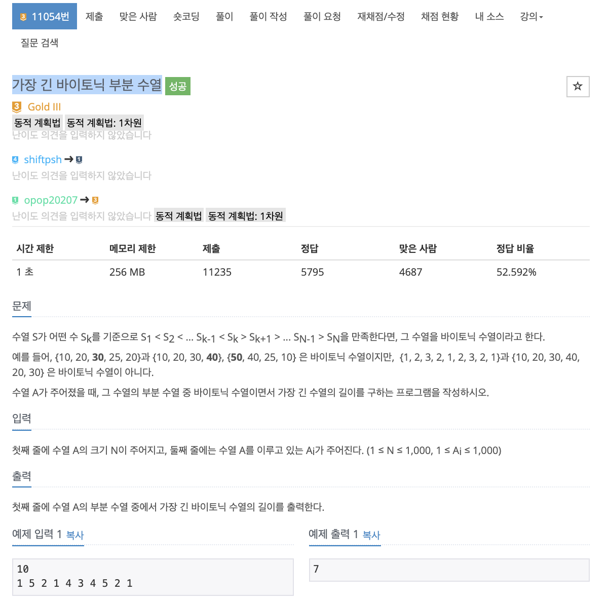 # https://www.acmicpc.net/problem/11055, https://www.acmicpc.net/problem/11053, https://www.acmicpc.net/problem/11722 를 풀어봤다면 문제 접근은 어렵지 않다. 특정 인덱스 까지의 앞에서부터의 증가하는 부분수열 + 뒤에서부터의 증가하는 부분수열을 생각한다면 바로 풀 수 있다.