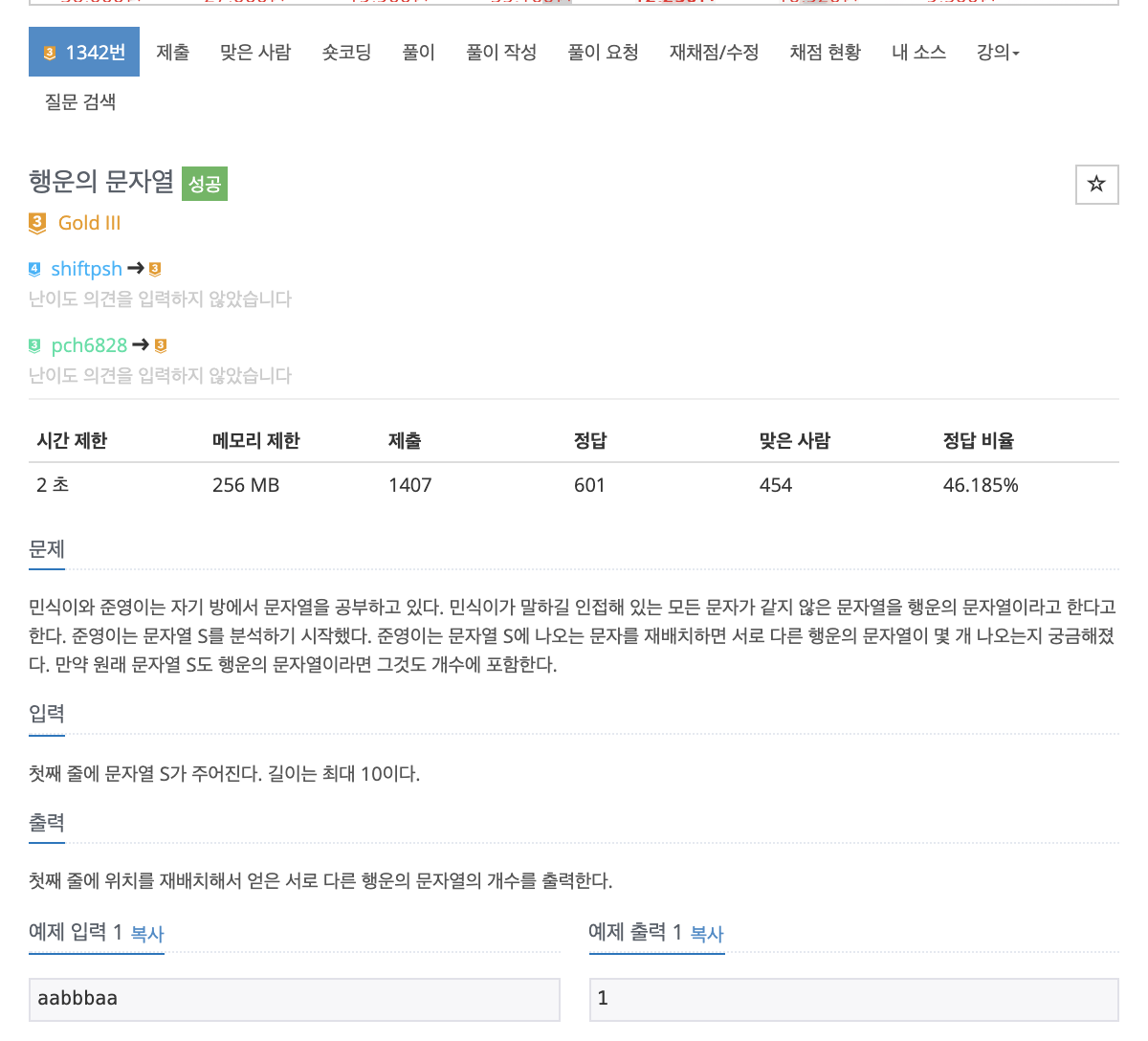 # dfs, 순열의 개념을 알고있었다면 그렇게 어렵지 않은 문제. 시간초과만 주의해주면 된다. 맨 처음에는 순열을 호출할때마다 조건문으로 검사하거나 순열의 파라미터를 String이나 리스트로 넘겼는데, 시간초과가 났다. 그래서 우선 길이에 맞는 순열을 만들때마다 조건문으로 행운의 문자열인지 체크해줘서 count++하면 된다. 이 때 리스트의 첫 번째인덱스부터 다음 인덱스와 같으면 false를 리턴하게 하면 된다.
