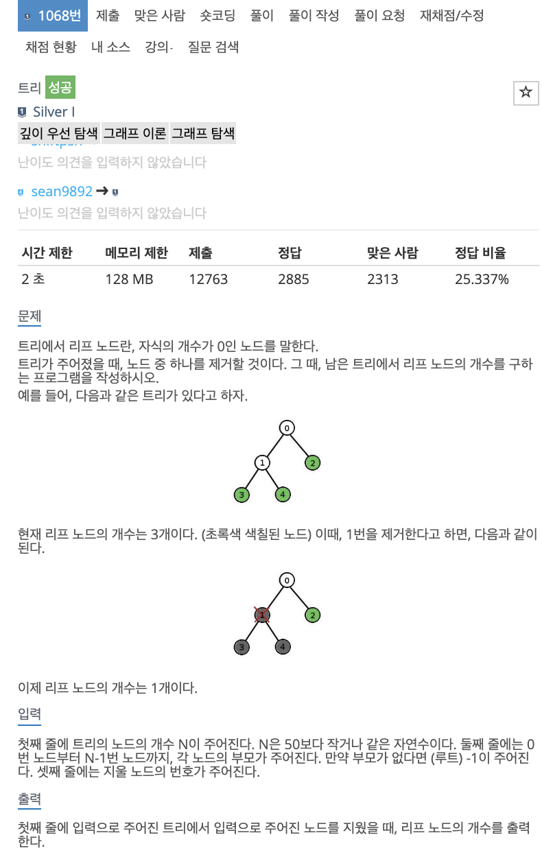 # 맨 처음에는 당연히 이진트리인줄 알고 풀었지만, 이진트리가 아니었다. 그것만 따지면 어렵지 않게 접근할 수 있다. N이 최대가 50이므로 나의 경우에는 어레이리스트를 배열로 선언하여, 연결되는 번호를 다 저장하였고 삭제할 번호를 반복문을 통해 리스트에서 찾아서 제거한 후 해결하였다. 항상 문제를 잘 읽고 풀어야지 하는데 고쳐지질 않는다..