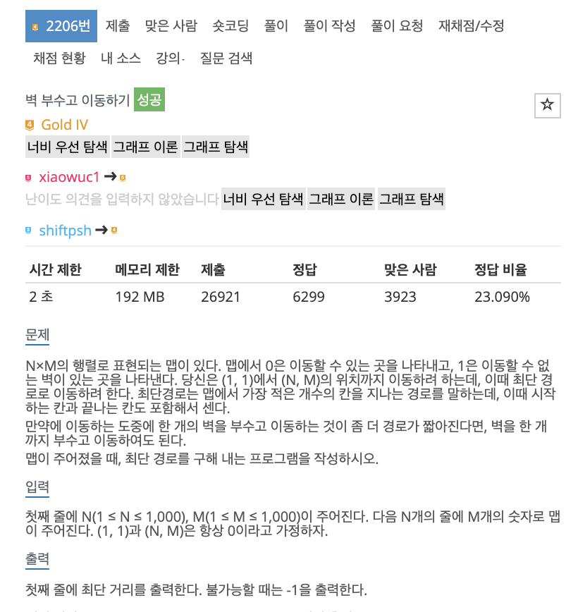 # 기존 bfs에서 조금 더 복잡해진 문제. 따로 저장할까 생각하려다가 벽을 뚫었는지 아닌지 체크하기위해 배열을 3차원으로 선언하여 문제를 해결.