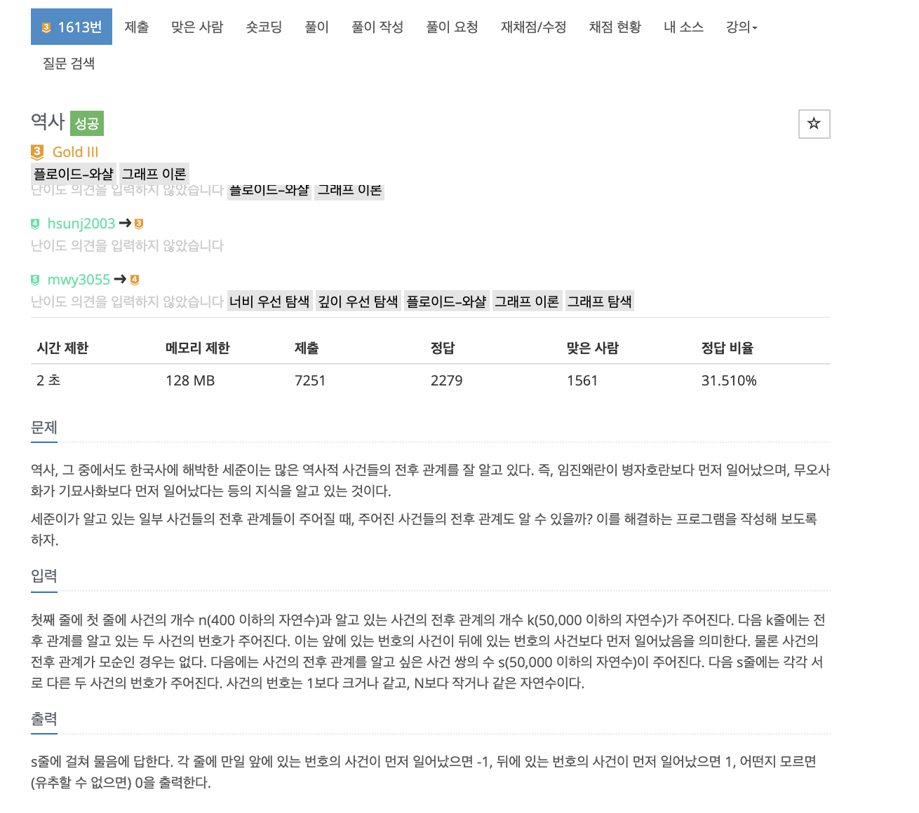 # dfs,bfs 로도 풀 수 있지만 문제를 보면 시작점, 도착점, 중간점을 이용해서 문제를 해결할 수 있다. 예를 들어 1번 사건이 2번 사건보다 먼저 일어났고, 2번 사건이 3번 사건 보다 먼저 일어났다면 1번과 3번중에 먼저 일어난 사건은 1번이다. 플로이드 와샬로 해결해보자면 1번이 시작점, 2번이 중간점, 3번이 도착점이다.